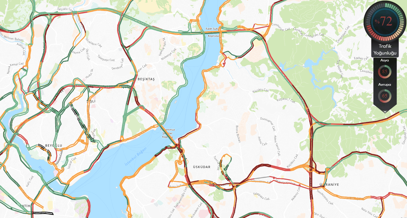 İstanbul Büyükşehir Belediyesi (İBB) Cep Trafik Haritası verilerine göre, sabah 08.30 itibarıyla trafik yoğunluğu yüzde 72 seviyesine ulaştı. Özellikle D-100 kara yolu, TEM Otoyolu, 15 Temmuz Şehitler Köprüsü ve Fatih Sultan Mehmet Köprüsü geçişlerinde yoğunluk gözlemlendi.