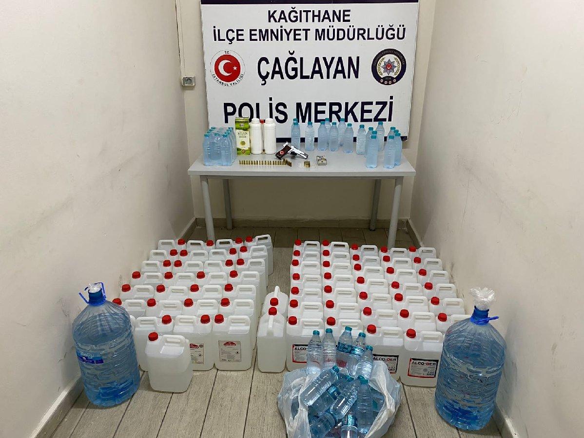 Kağıthane Çağlayan Polis Merkezi Amirliği ekipleri sahte alkol satışı yaptığı tespit edilen şahsı, 15 gün takip edip müşterisine satış yaptığı esnada suçüstü yakaladı. Şahsın evinde ve işyerinde arama yapan polis ekipleri, yaklaşık 400 litre sahte alkol ve ruhsatsız tabanca ele geçirdi. Yapılan aramalar ise kameralara yansıdı.