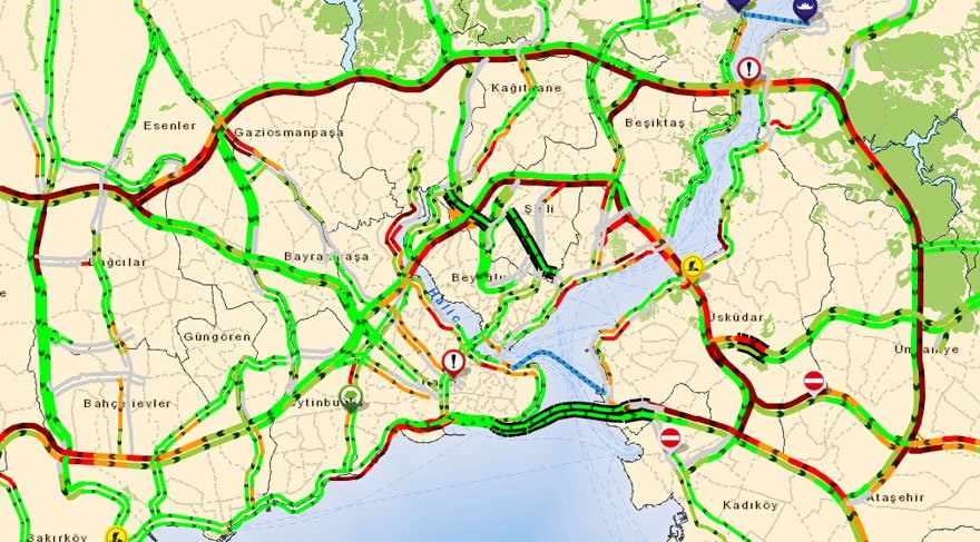 İstanbul Büyükşehir Belediyesi'nin trafik yoğunluğu haritasına göre saat 15.45 sıralarında yoğunluk yüzde 51 seviyelerinde. Trafik yoğunluğunun özellikle köprülerde etkili olduğu görülüyor. Avrasya Tüneline girişler de felç durumda. Özellikle TEM Otoyolu Avrupa-Anadolu istikametinde FSM Köprüsü trafiği neredeyse Mahmutbey Gişeleri'ne kadar uzamış durumda. Diğer mevkilerde ise zaman zaman yoğunluk yaşanıyor.