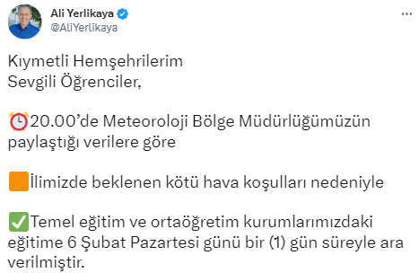 * Kıymetli Hemşehrilerim Sevgili Öğrenciler, 20.00’de Meteoroloji Bölge Müdürlüğümüzün paylaştığı verilere göre ilimizde beklenen kötü hava koşulları nedeniyle Temel eğitim ve ortaöğretim kurumlarımızdaki eğitime 6 Şubat Pazartesi günü bir (1) gün süreyle ara verilmiştir.