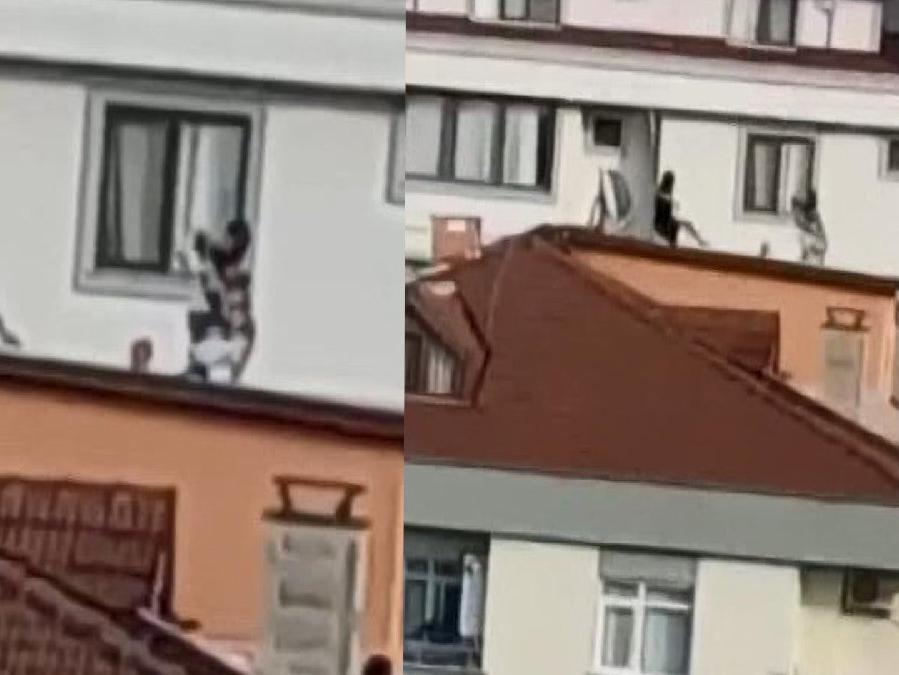 Sosyal medya hesaplarından ilginç paylaşımlar yapmak amacıyla çatıda fotoğraf çeken gençler, çevredeki bir kişi tarafından cep telefonu kamerasıyla görüntülendi.