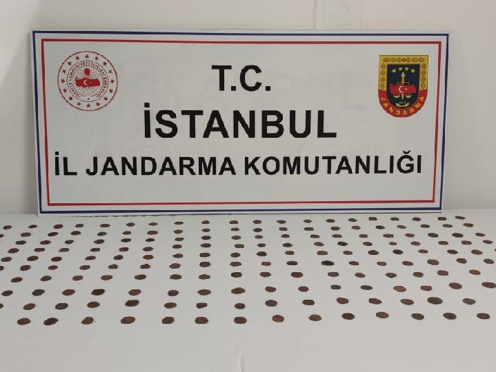 İstanbul İl Jandarma Komutanlığı ekiplerince düzenlenen tarihi eser kaçakçılığı operasyonuyla; Bizans dönemine ait 200 adet tarihi sikke ele geçirildi. Tarihi sikkeleri satmaya çalışan 3 şahıs gözaltına alındı.