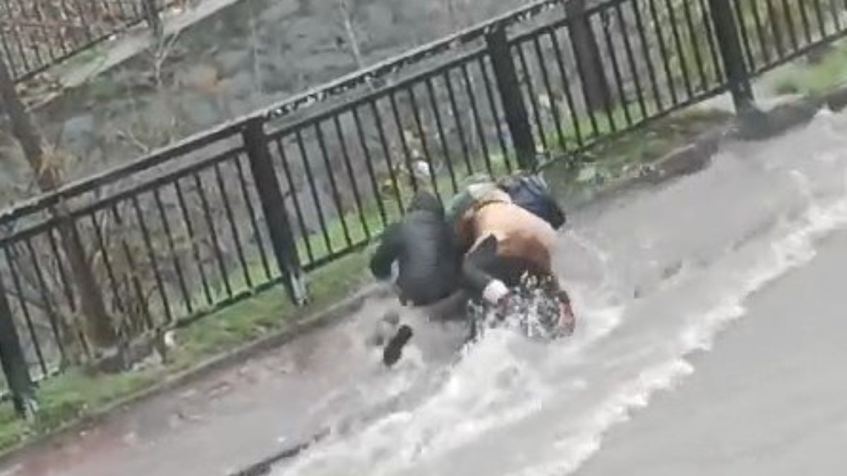 Esenyurt Hürriyet Mahallesi'nde vatandaşlar sel akan yolda karşıdan karşıya geçmekte zorlanırken bir veli çocuğu ile karşıdan karşıya geçmeye çalışırken akıntı nedeni ile yere düştü. Anne ve oğlu sele kapılmaktan son anda kurtuldu, çareyi geri dönmekte buldu.