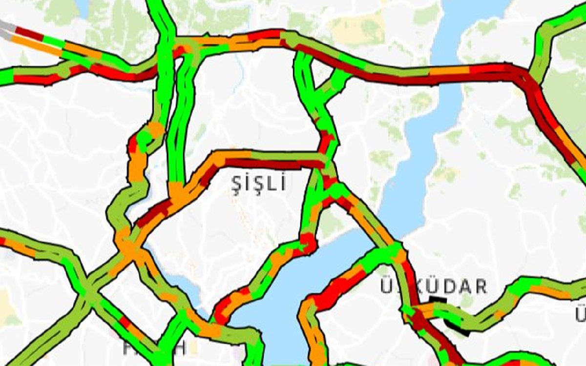 İBB Trafik Haritasında saat 00.33'te trafik yoğunluğu yüzde 53'e yükseldi.