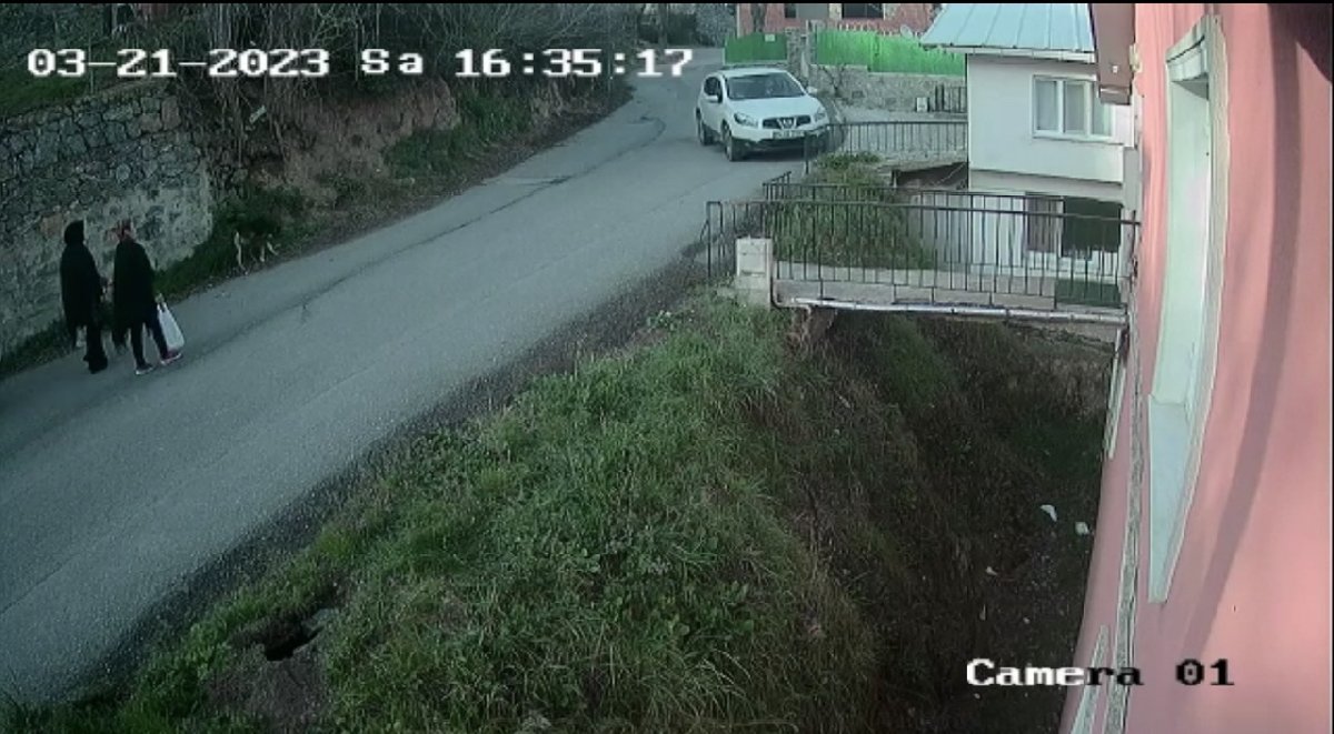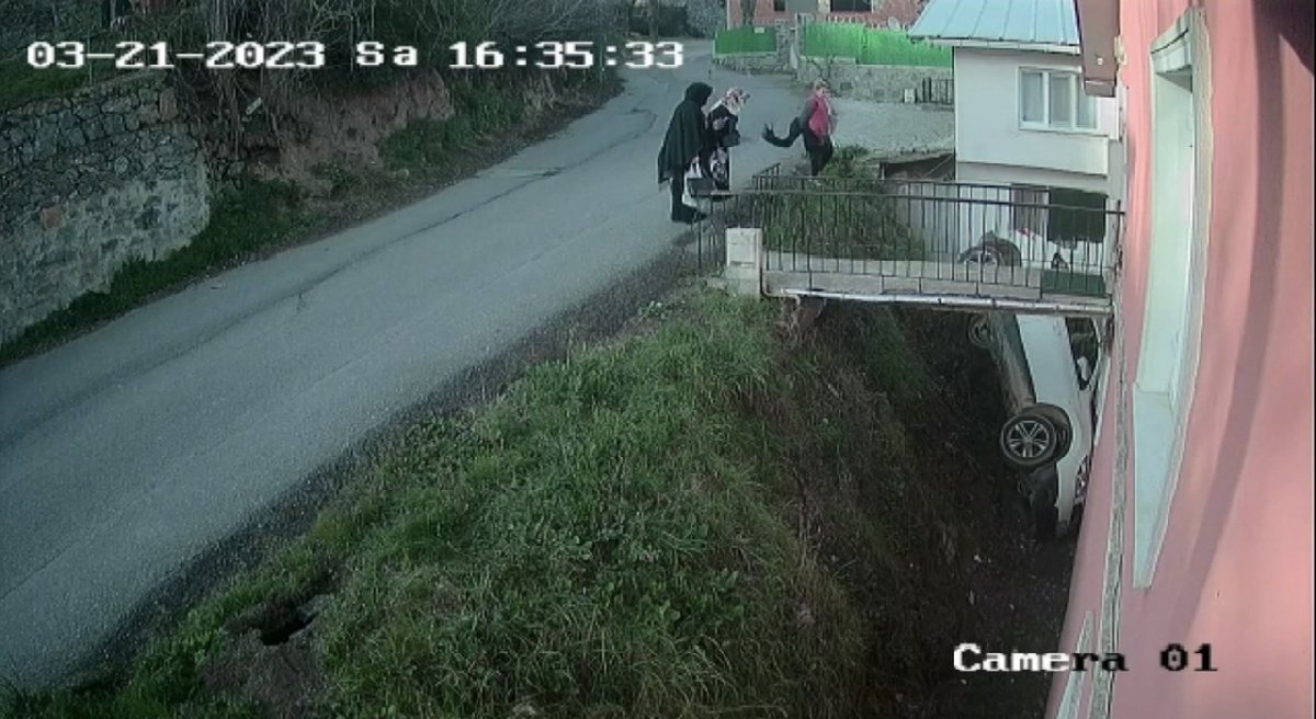 Otomobilin apartman ile yol arasındaki boşluğa düştüğü anlar güvelik kamerasına yansıdı. Görüntülerde virajı alamayan sürücünün otomobiliyle apartmanın demirlerine çarptığı, kısa süreliğine duraksayan aracın daha sonra bina ile yol arasındaki boşluğuna düştü.