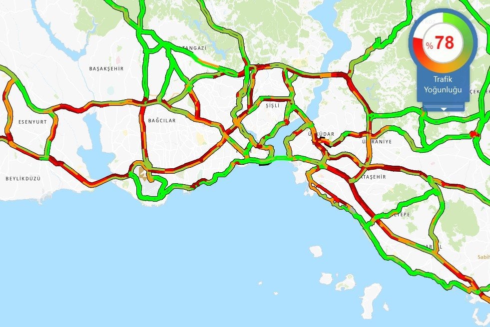 İstanbul Büyükşehir Belediyesi (İBB) Trafik Yoğunluk Haritası'na göre kent genelindeki trafik yoğunluğu yüzde 70'i aştı.