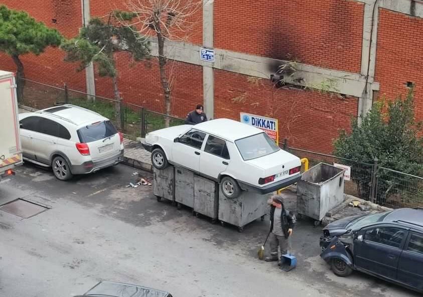 Duruma öfkelenen esnaf 2 gündür alınmayan otomobili, forklift kaldırarak çöp konteynerlerinin üzerine bıraktı.