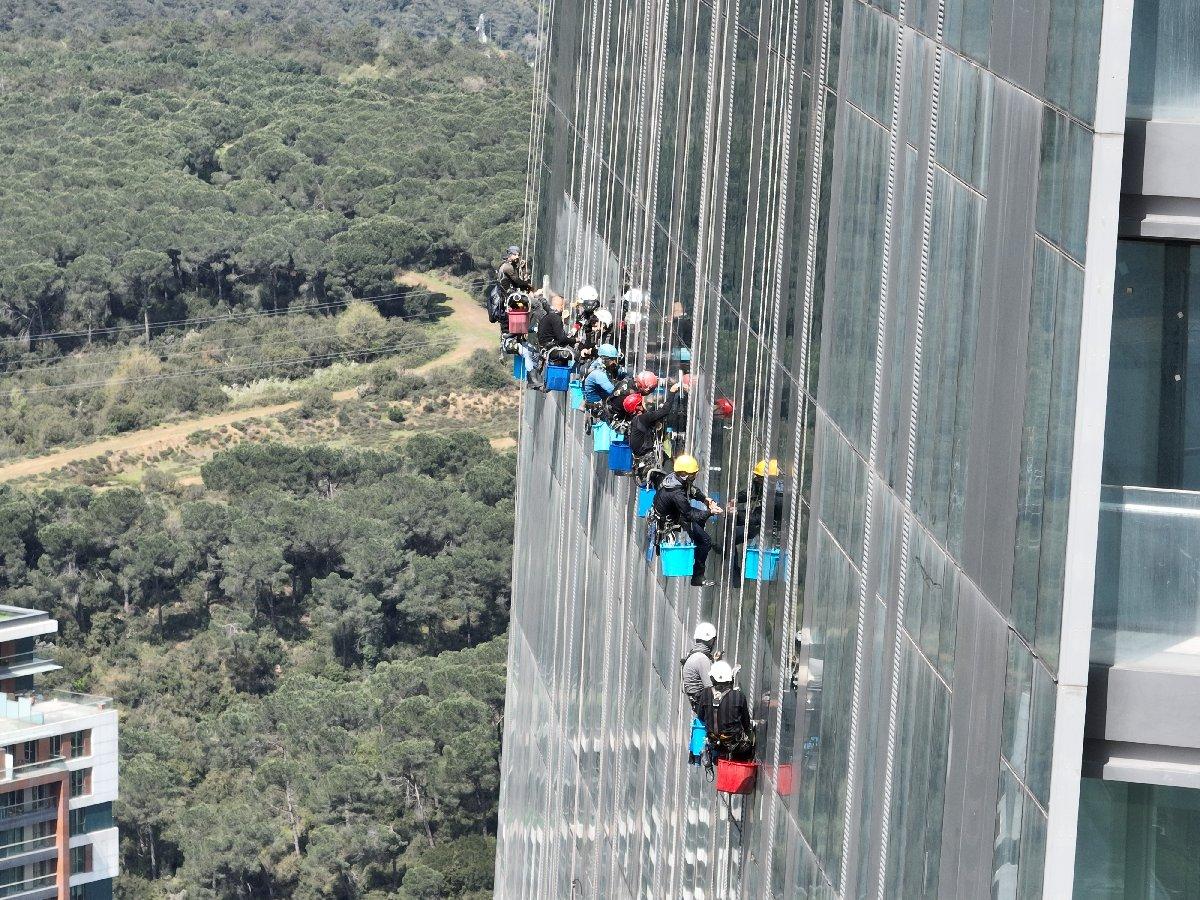 Rüzgarda veya mahsur kalma durumlarında iple erişimin daha güvenli olduğunu ifade eden iple erişim teknisyeni Emrah Polat, “Sepetle erişilemeyen birçok noktada iple erişim sistemlerini kullanıyoruz. İple çalışmak için bir haftalık bir eğitim alıyoruz. Ancak tek başınıza çıkamıyorsunuz bu eğitimden sonra mutlaka yanınızda deneyimli birisinin bulunması zorunludur. Her gökdelenin temizlenmesi yüzeyi ve hava koşullarıyla birlikte değişiklik gösteriyor. Ortalama 10 kişi ile bir gökdeleni temizlemek 20 gün sürüyor. Çalıştığımız gökdelenin en yüksek noktası 300 metre civarındadır. İlk başladığımız zaman herkeste olduğu gibi bizimde korkumuz oldu ancak daha sonra yaşadığımız adrenalin bizi daha çok işimize bağladı. Bizim için ipte olmak yerde yürümek kadar güvenliklidir” dedi.