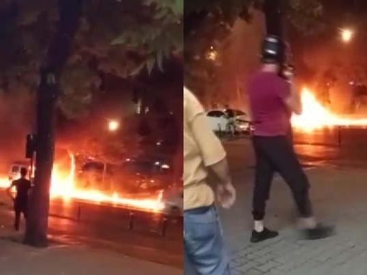 Görüntülerde hafif ticari araç ile temizlik kamyonundan ve asfalt zeminden alevlerin yükseldiği görüldü.