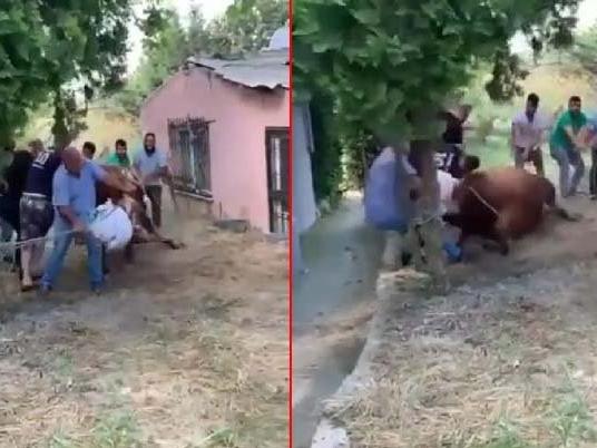 Sahibi ile birlikte 7 kişi boğayı tutmak için yanaştı. Bir kişi kuyruğundan, iki kişi arka bacaklarındaki ipten kurbanlığı  tutarken 4 kişi de gövde tarafından boğayı tutmaya başladı. Ancak boğa, kendisini tutanlara tüm gücüyle direndi.