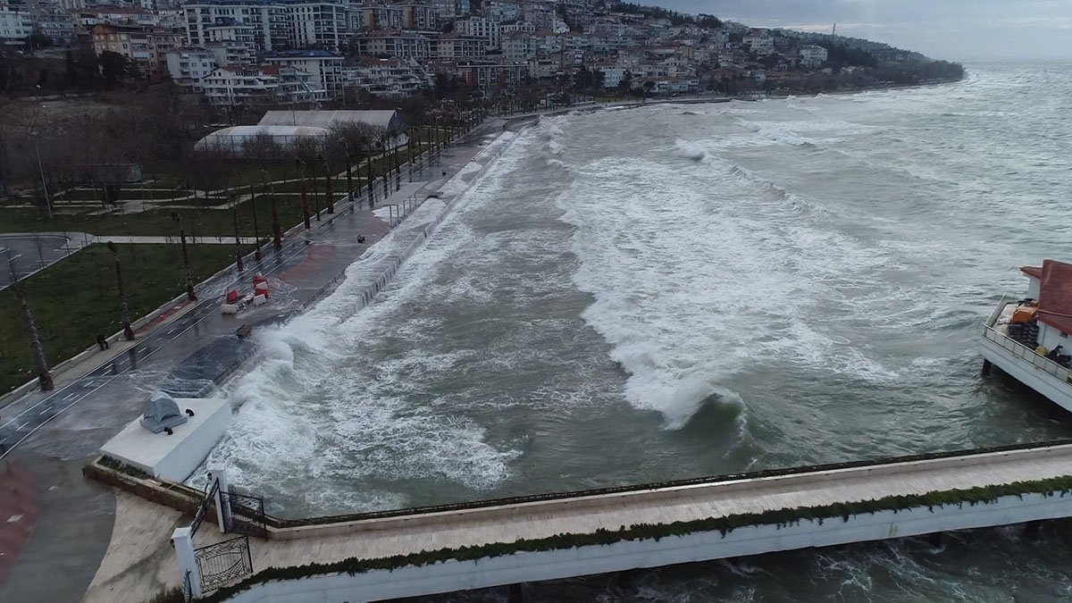 Büyükçekmece'de sabah saatlerinden itibaren etkili olan lodos denizde dev dalgalar oluşturdu. Albatros Sahili'nde dalgaların boyunun zaman zaman metrelerce yukarı çıktığı görüldü. Sahile vuran dalgalar havadan görüntülendi. Meteoroloji Genel Müdürlüğü'nden yapılan uyarılara göre lodosun yarın da etkili olması bekleniyor.