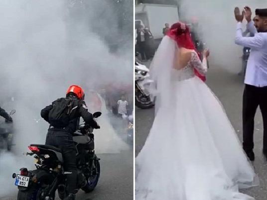 O anlar ise cep telefonu kamerasına yansıdı. Görüntülerde, motosiklet sürücülerinin uzun süre patinaj çektiği, damadın arkadaşlarını alkışladığı görüldü. Konvoy yüksek ses çıkararak gözlerden kayboldu. (DHA)