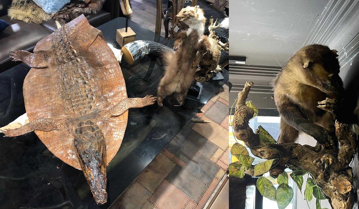 Adrese giren ekipler, doldurulmuş hayvanlarla karşılaştı. Aramalarda 18 adet flamingo, kınalı keklik, beyaz gelincik, timsah, vervet maymunu, dağ keçisi, kızıl geyik, sansar, kızıl  akbaba, tavuskuşu tahniti ele geçirildi.