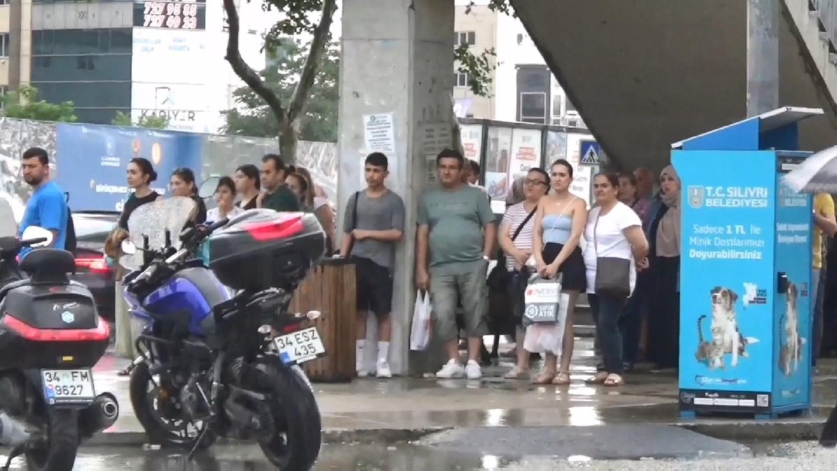Silivri'de yağış nedeniyle ilçe merkezinde trafik durma noktasına geldi. Vatandaşlar yağmurun dinmesini durak ve bina girişlerine sığınarak bekledi.
