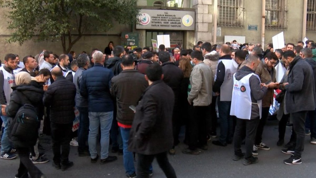 Basın açıklamasını Öz Sağlık İş Sendikası İstanbul 3 NO'lu Şube Başkanı Ergin Balekoğlu ve Öz Sağlık-İş Sendikası 2 NO'lu Şube Başkanı Erdem Dinç yaptı.