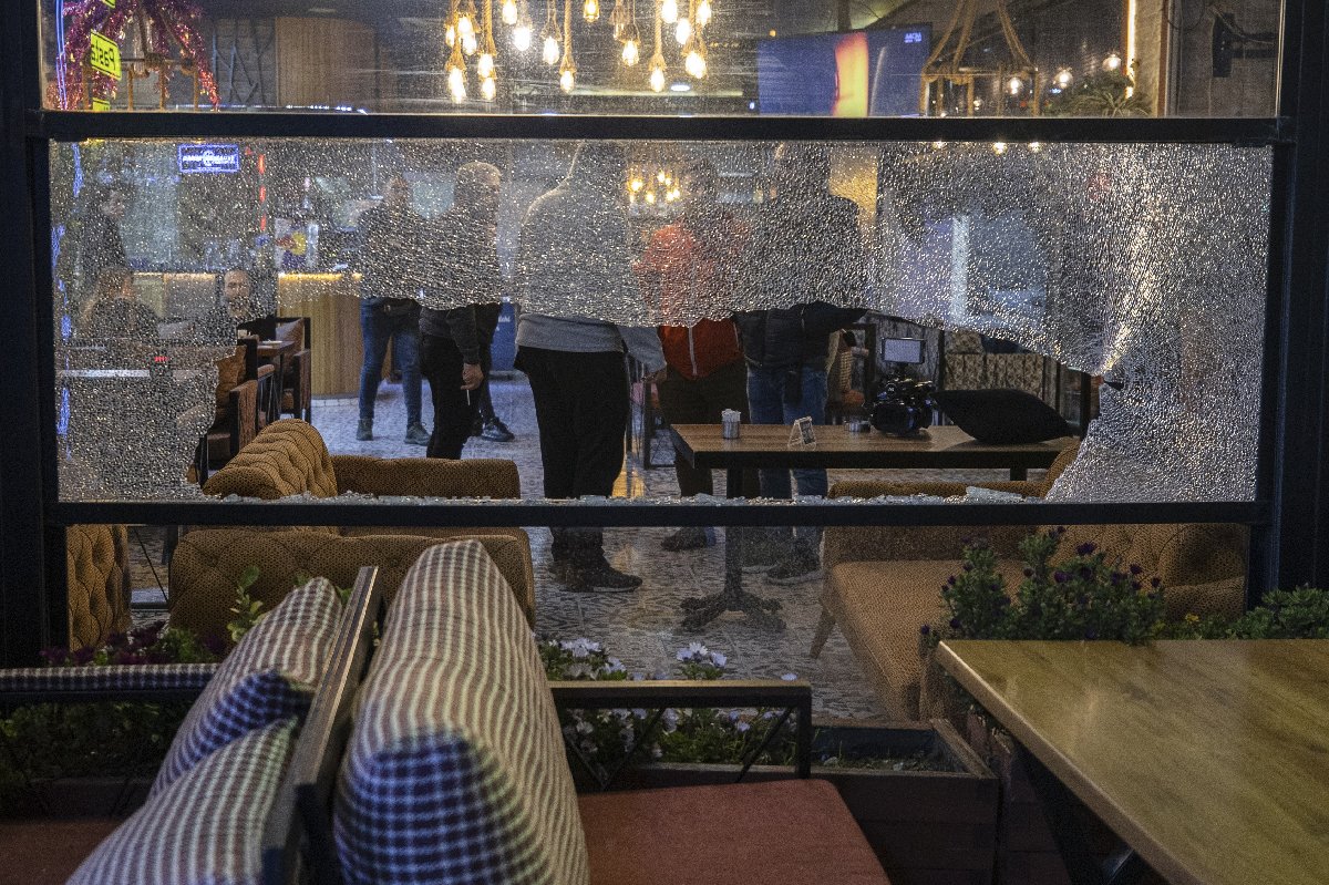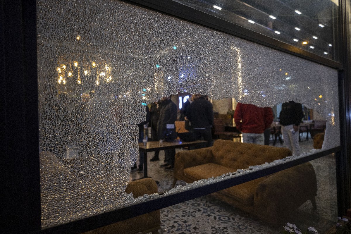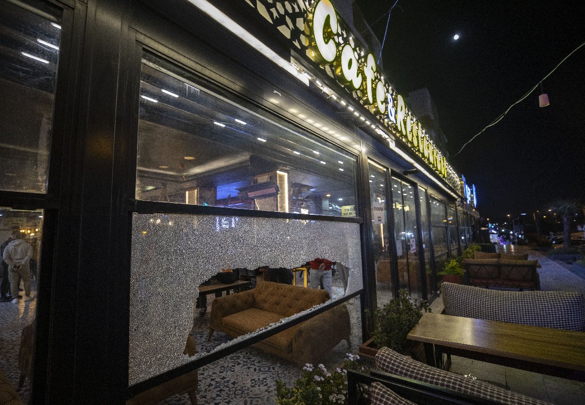Camları kırılan kafenin de güvenlik kamera görüntülerini inceleyen polis ekipleri olay sonrası kaçan şüphelileri yakalamak için çalışma başlattı. (DHA)