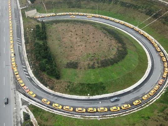 Sabahın erken saatlerinden itibaren bekleyen taksiciler uzun kuyruklar oluşturdu. Öte yandan, taksicilerin oluşturduğu uzun kuyruk havadan görüntülendi.