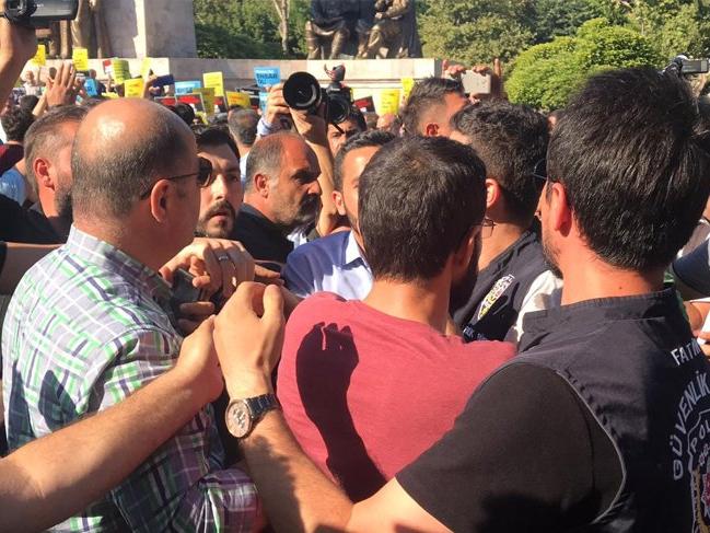 Portesto düzenleyen derneklere tepki gösterenlere polis müdahalede bulundu ve alandan çıkarttı.