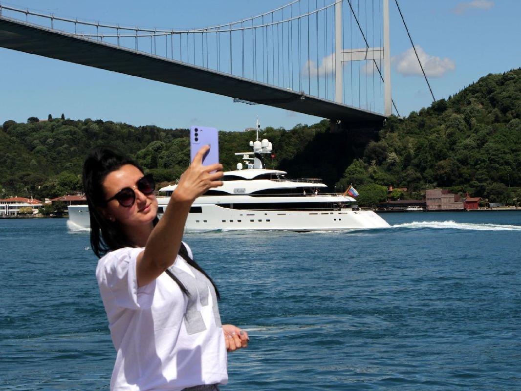 65 metre uzunluğunda ve 12 metre genişliğindeki lüks yat dün saat 13.30 sıralarından Marmara Denizi'nden İstanbul Boğazı'na girdi. Yaklaşık 1 saatte Fatih Sultan Mehmet Köprüsü altına ulaşan yatı gören kıyıdaki bazı turistler geminin fotoğrafını çekerken bazıları ise dikkatli gözlerle izledi.