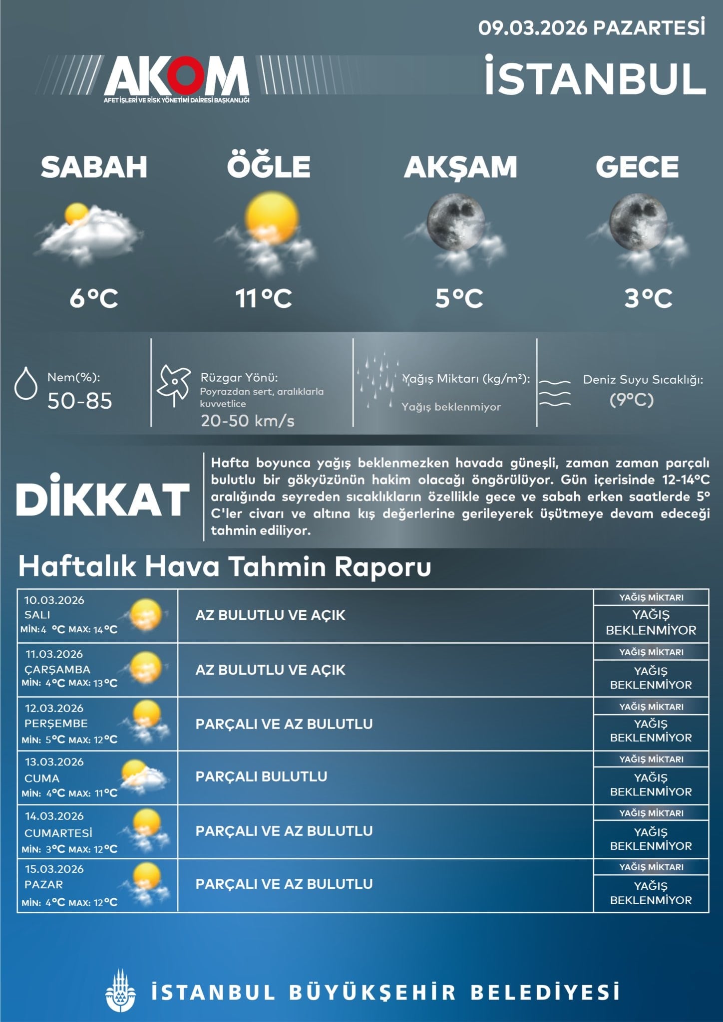 "Hafta boyunca yağış beklenmezken havada güneşli, zaman zaman parçalı bulutlu bir gökyüzünün hakim olacağı öngörülüyor. Gün içerisinde 12-14°C aralığında seyreden sıcaklıkların özellikle gece ve sabah erken saatlerde 5º C'ler civarı ve altına kış değerlerine gerileyerek üşütmeye devam edeceği tahmin ediliyor."