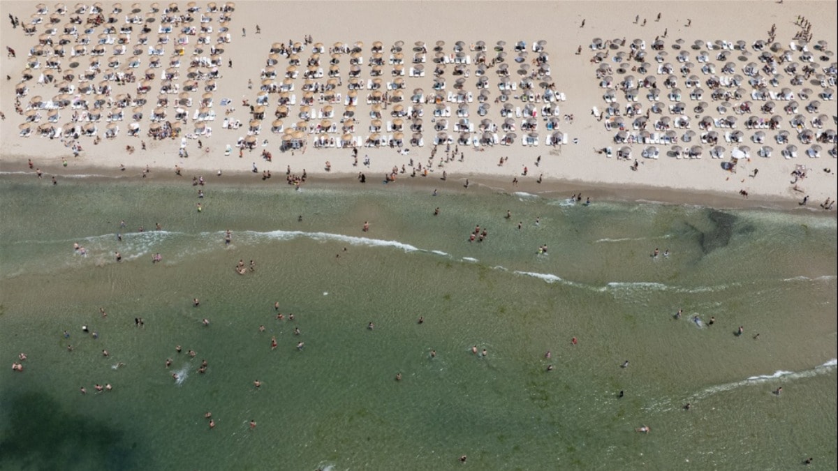 Florya'daki Güneş Plajı'nda denize giren ve güneşlenenlerin oluşturduğu yoğunluk ise havadan görüntülendi.