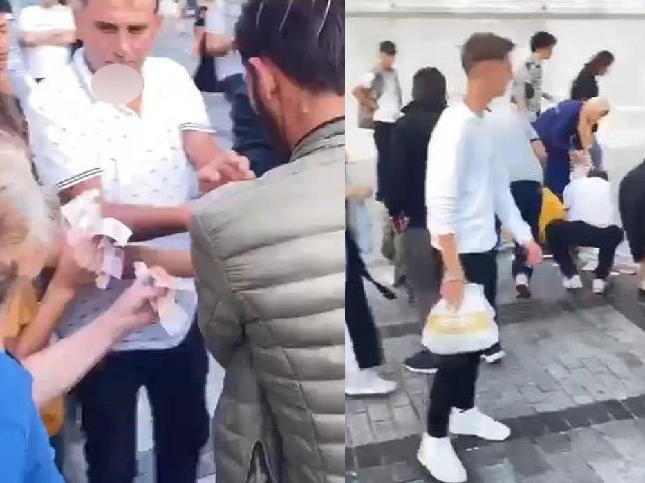 Eminönü Meydan'da cuma öğle saatlerinde bir kişi, meydana gelerek poşette bulunan paraları havaya saçmaya başladı. Çevredekiler paraları toplayıp poşete doldurdu.