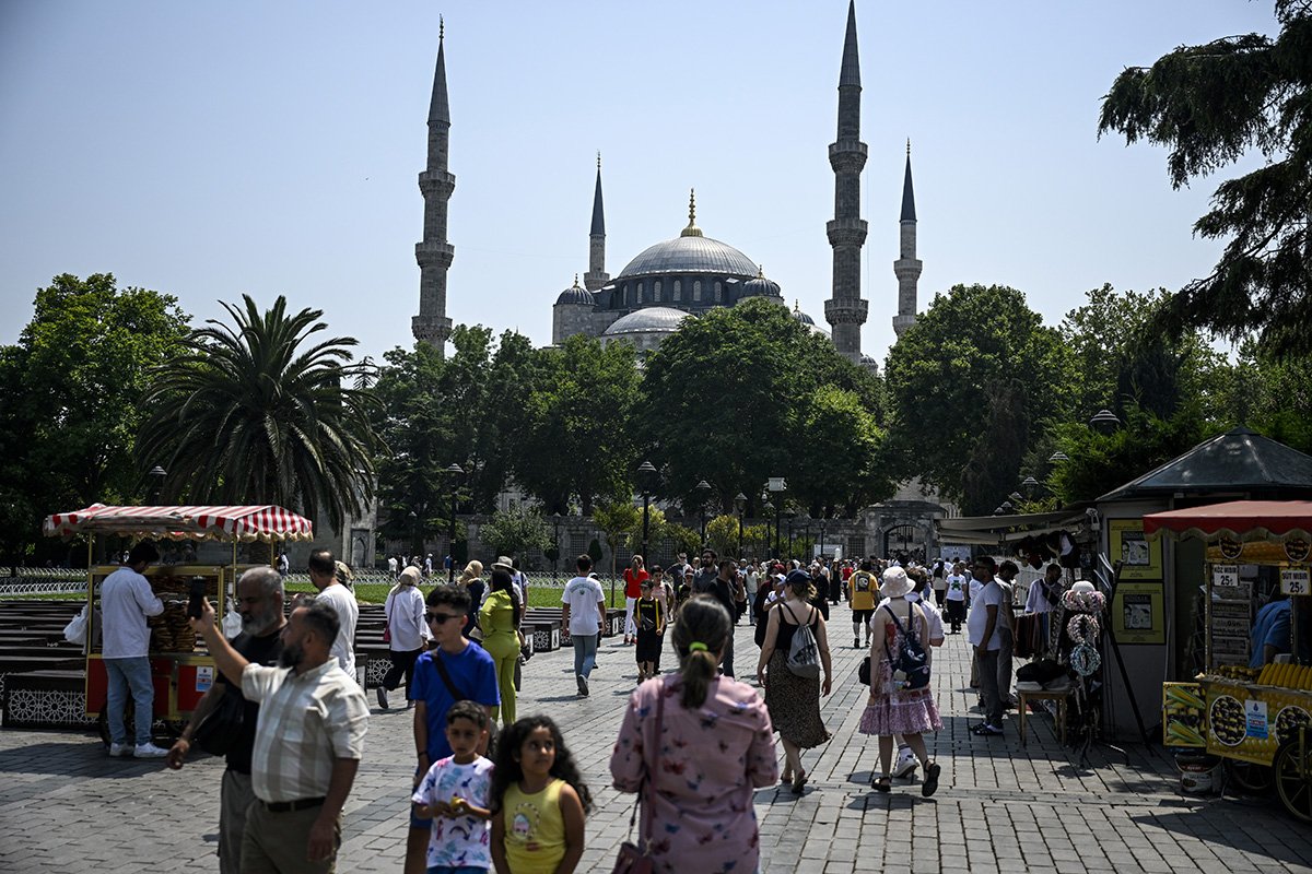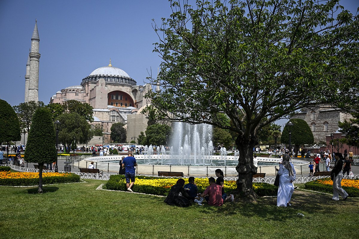 Sultanahmet Meydanı'na gelen vatandaşlarla turistlerin, çocuklarını bebek arabasına taktıkları güneşliklerle koruduğu görüldü.