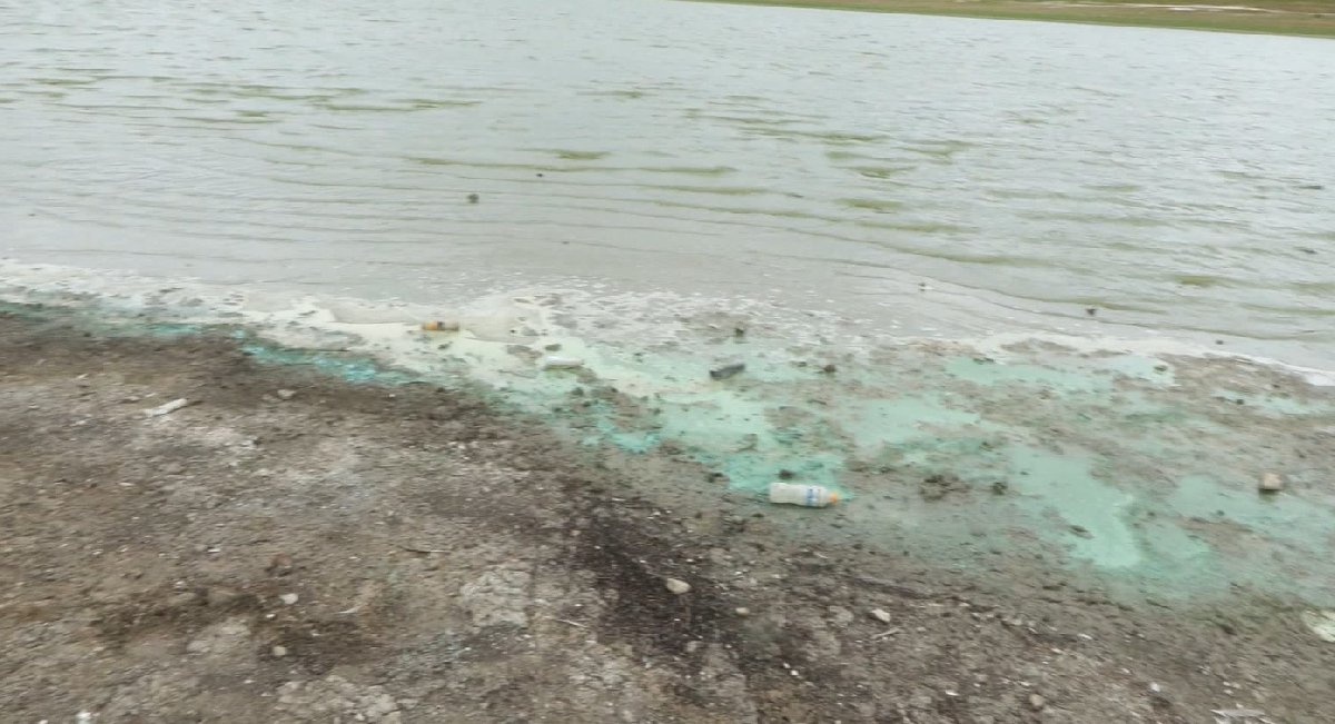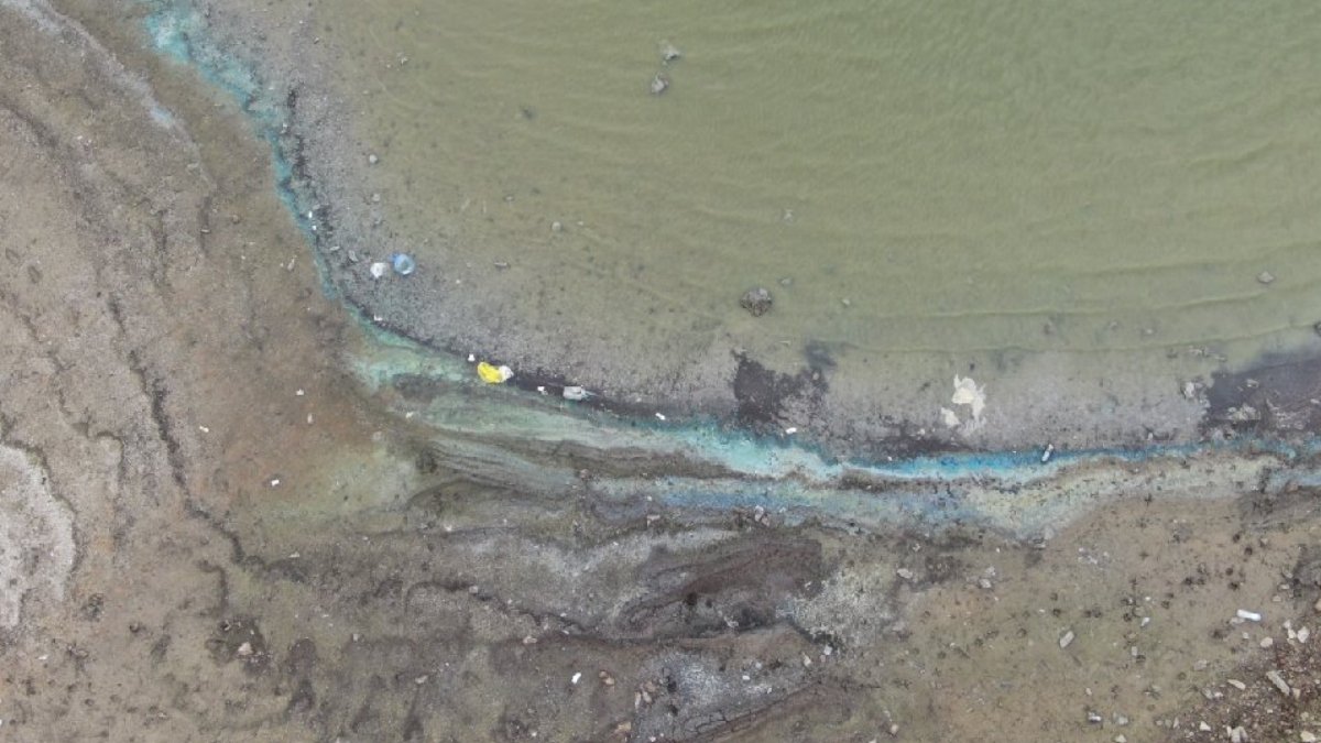 Su üzerinde oluşan ayrı bir tabaka, göl kenarındaki otlar ve taşlar üzerinde de yayılmış durumda. Ayrıca, göle ve çevresine atılan pet şişe, terlik ve poşet gibi çöpler de dikkat çekti.