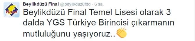 Türkiye birincisi gururu yaşayan okullar arasında kapatılan dershanelerin yerine kurulan temel liseler de var. Beylikdüzü Final Temel Lisesi, 3 puan türünde birincilik getiren öğrencisinin başarısını sosyal medyadan duyurdu.