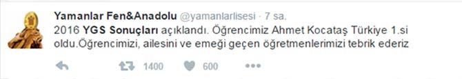Ahmet Kocataş'ın birinciliği de okulunun sosyal medya hesabından duyuruldu.