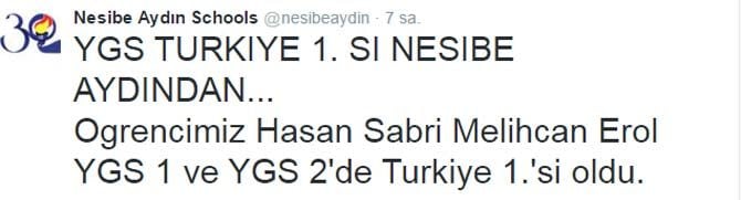 YGS-1 ve YGS-2'de Türkiye birincisi olan Hasan Sabri Melihcan Erol, Ankara Nesibe Aydın Okulları öğrencisi. Kurum öğrencisinin başarısını sosal medyadan paylaştı.