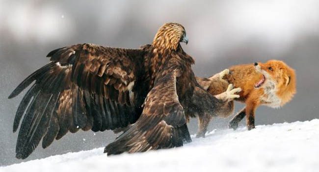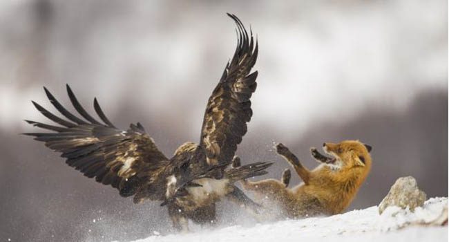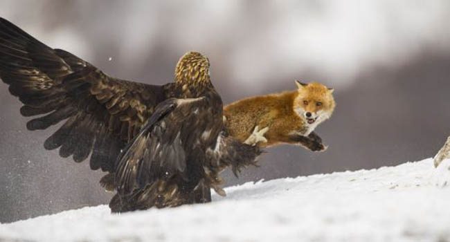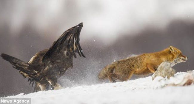 Buna izin vermeyen kartal tilkiyi penceleriyle uzaklaştırıyor.