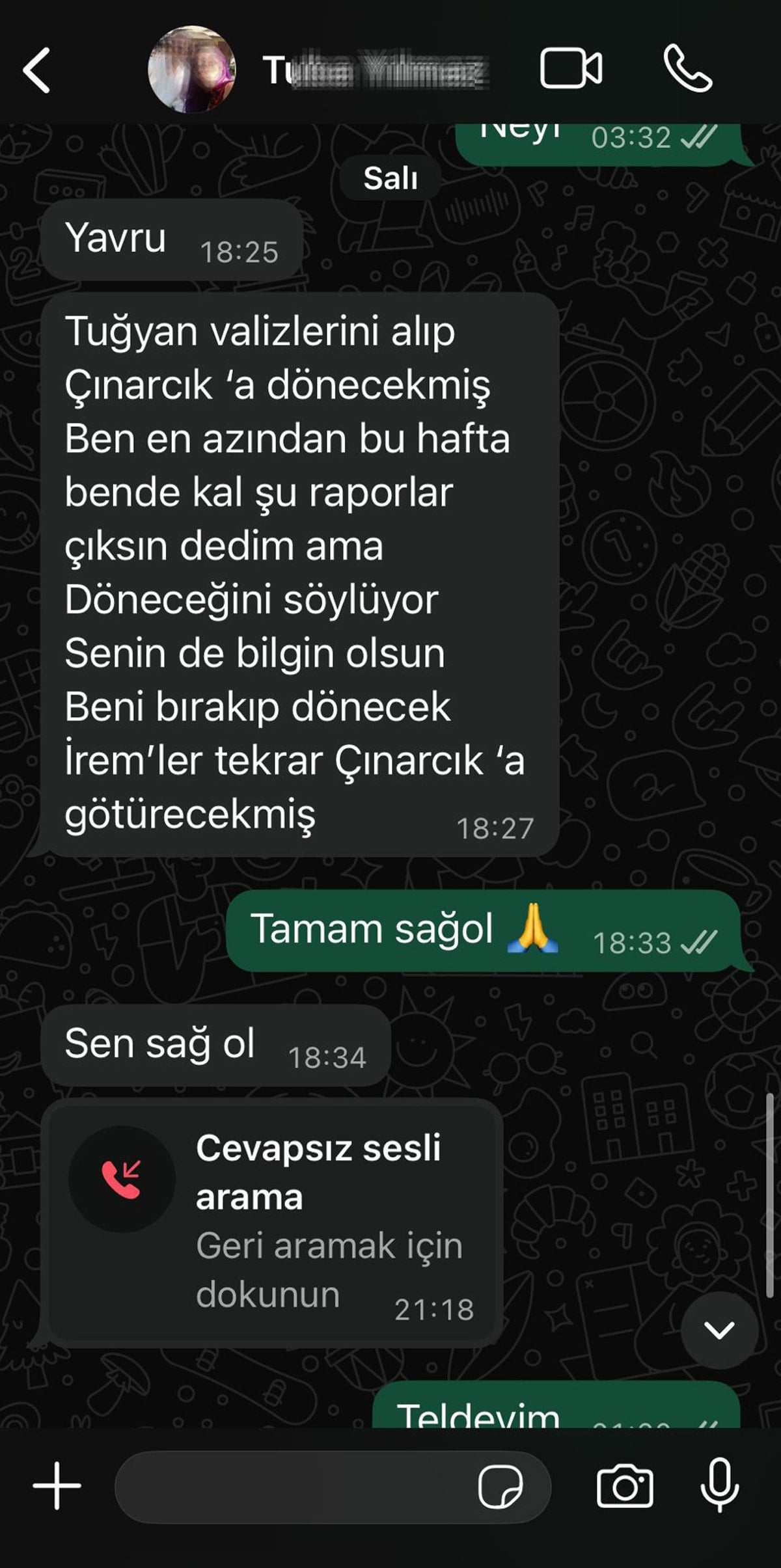Çelik, Gülter ile Sultan Nur Ulu’nun, Büyükçekmece’de kaldıkları evin sahibi olan T.Y.’nin de Çiğdem D.E.’ye, “Tuğyan valizlerini alıp, Çınarcık’a dönecekmiş. Ben, ‘En azından bu hafta bende kal şu raporlar çıksın’ dedim ama döneceğini söylüyor. Senin de bilgin olsun” dediğini ve gözaltına alınmadan dakikalar önce de “Çocuklar şimdi çıktı, haber vereyim” diyerek mesaj attığını belirtti.