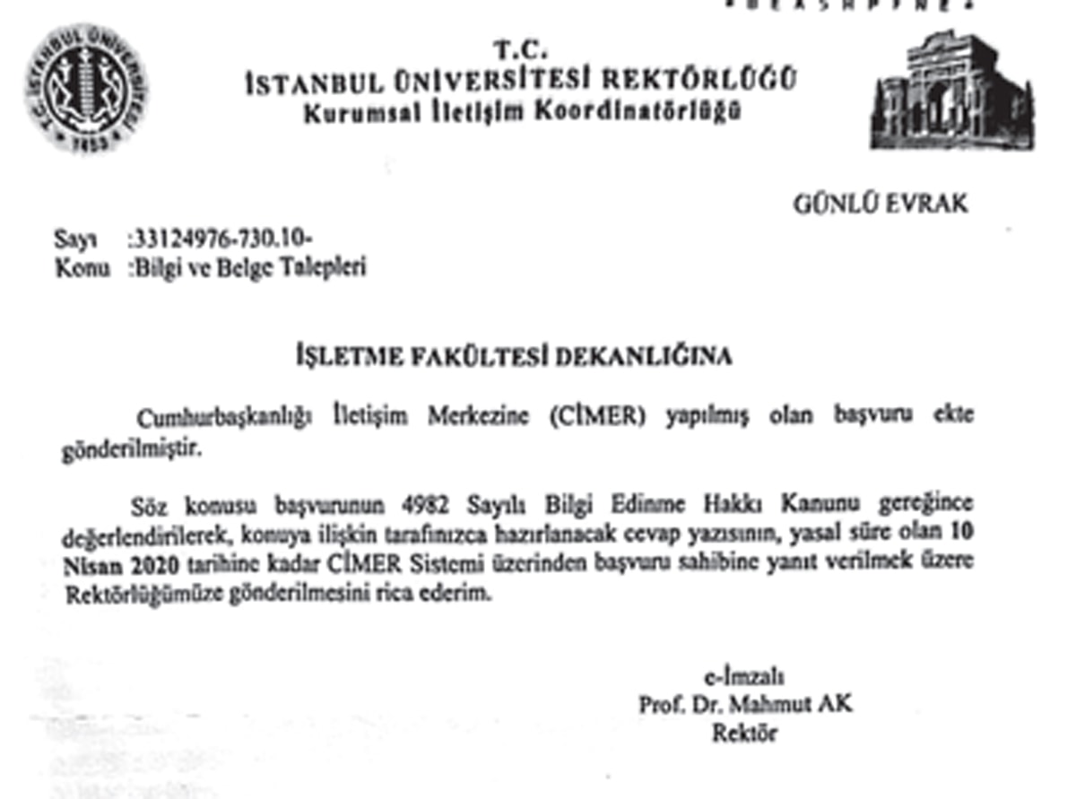 “Cumhurbaşkanlığı İletişim Merkezi’ne (CİMER) yapılmış olan başvuru, ekte gönderilmiştir. Söz konusu başvurunun Bilgi Edinme Hakkı Kanunu gereğince değerlendirilerek, konuya ilişkin tarafınızca hazırlanacak cevap yazısının, yasal süre olan 10 Nisan 2020 tarihine kadar CİMER sistemi üzerinden başvuru sahibine yanıt verilmek üzere Rektörlüğümüze gönderilmesini rica ederim.”