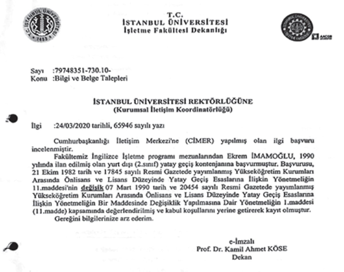 “Cumhurbaşkanlığı İletişim Merkezi’ne (CİMER) yapılmış olan ilgili başvuru incelenmiştir. Fakültemiz İngilizce İşletme programı mezunlarından Ekrem İmamoğlu, 1990 yılında ilan edilmiş olan yurtdışı (2.sınıf) yatay geçiş kontenjanına başvurmuştur. Başvurusu, 21 Ekim 1982 tarih ve 17845 sayılı Resmi Gazetede yayımlanmış Yükseköğretim Kurumları Arasında Önlisans ve Lisans Düzeyinde Yatay Geçiş Esaslarına İlişkin Yönetmeliğin ll. maddesinin değişik 7 Mart 1990 tarih ve 20454 sayılı Resmi Gazetede yayımlanmış Yükseköğretim Kurumları Arasında Önlisans ve Lisans Düzeyinde Yatay Geçiş Esaslarına İlişkin Yönetmeliğin Bir Maddesinde Değişiklik Yapılmasına Dair Yönetmeliğin 1.maddesi (11.madde) kapsamında değerlendirilmiş ve kabul koşullarını yerine getirerek kayıt olmuştur.