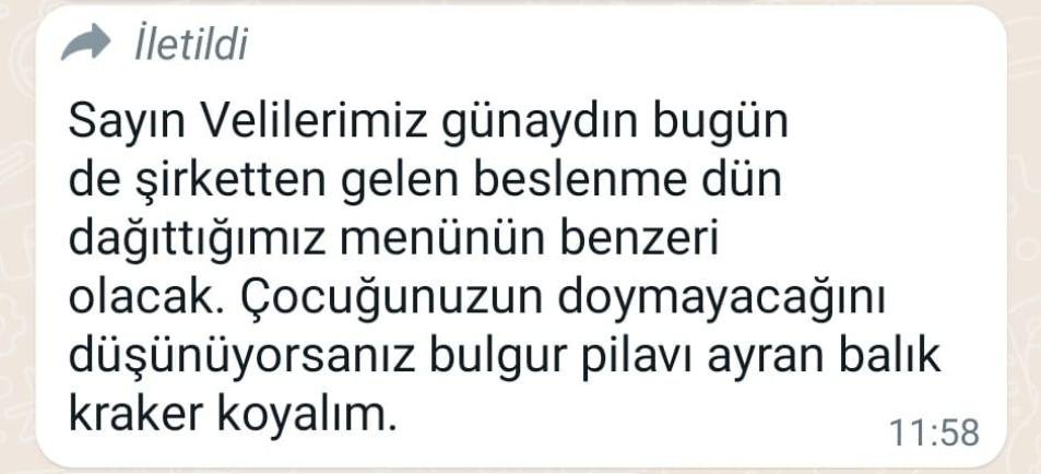 -Sayın velilerimiz günaydın. Bugün de şirketten gelen beslenme dün dağıttığımız menünün benzeri olacak. Çocuğunuzun doymayacağını düşünüyorsanız, bulgur pilavı, ayran, balık kraker koyalım.