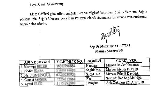 AKP’nin KPSS’ye girmeden devlet kademelerine yerleştirebilmek için kullandığı ‘VIP kadroların’ nasıl tahsis edildiği Manisa’da ortaya çıktı. AKP Manisa Milletvekili Muzaffer Yurttaş, TBMM antetli kağıdıyla “torpil” listesi yaptı. Yurttaş, listesinde yer alan isimlerin ‘uzman’ ya da ‘idari personel’ olarak atanması talimatı veriyor.