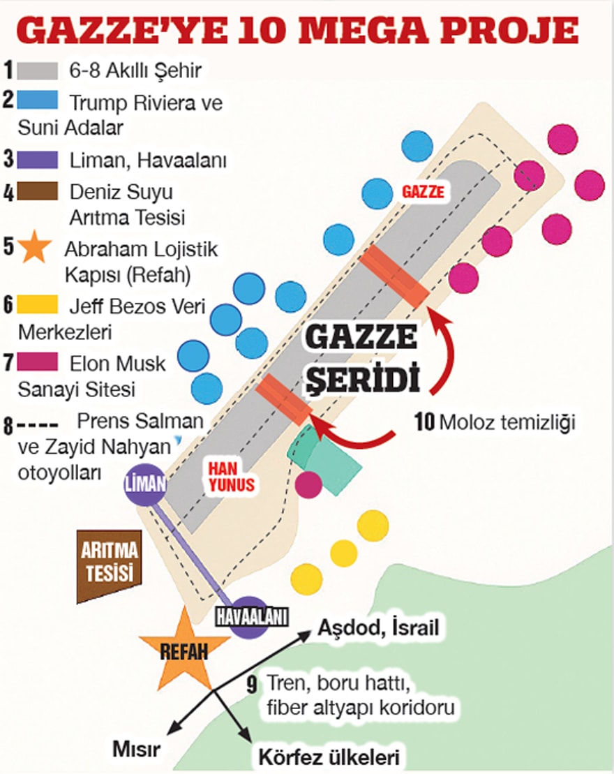 Washington Post ve Financial Times’a göre plan, Filistin’in en yoksul ve yıkılmış toprağını geleceğin yapay zekâ laboratuvarına çevirmeyi öngörüyor. “Elon Musk Üretim Alanları”, “MBZ Merkez Otoyolu”, “Refah Lojistik Merkezi...” Adeta bir yatırım kataloğu.