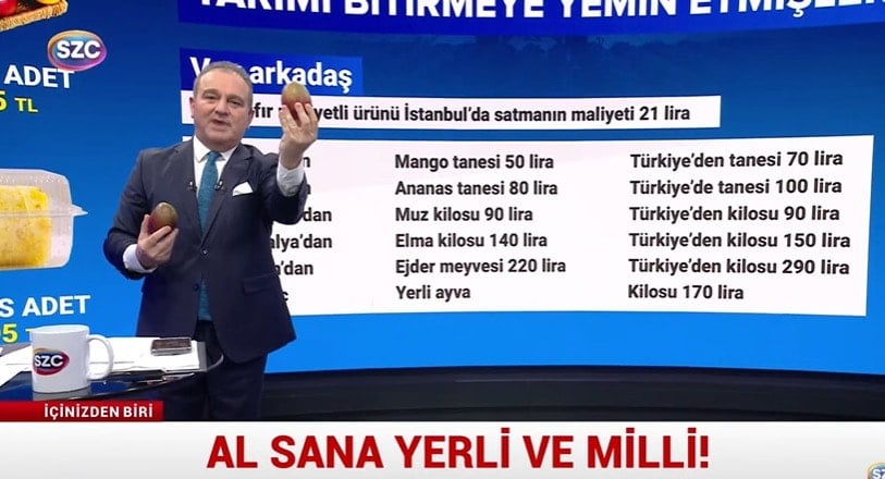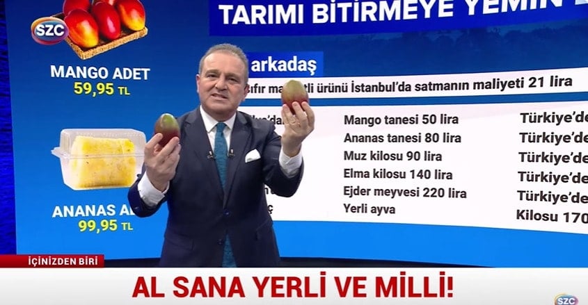 "- Tarımla ilgili Vay arkadaş diyoruz. Her gün şaşırıyoruz. Bakalım. Kilosu 0 liraya limon aldım. 0 liraya domates aldım. Kasaya koydum kamyona yükledim. İstanbul'a geldi. Rafa kondu. Bilabedelle aldığınız domates, elma, meyve sebze maliyeti 21 lira oluyor. Mango'da 50 lira, Türkiye'de üretilen ise 70 lira. Oksijen Gazetesi'nin emeğine sağlık çok iyi oturtmuşlar."