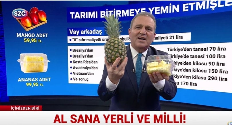 "- Değerli SÖZCÜ TV izleyicileri, Türkiye'de iktidar tarımı bitirmeye niyet etmiş gibi. Ananas Türkiye'de de ekilip biçiliyor ama ta uzaklarda Brezilya'dan da geliyor. O zaman soru şu, Brezilya'dan gelen ananas Türkiye'deki ananastan ucuz olabilir mi? Oluyor.
