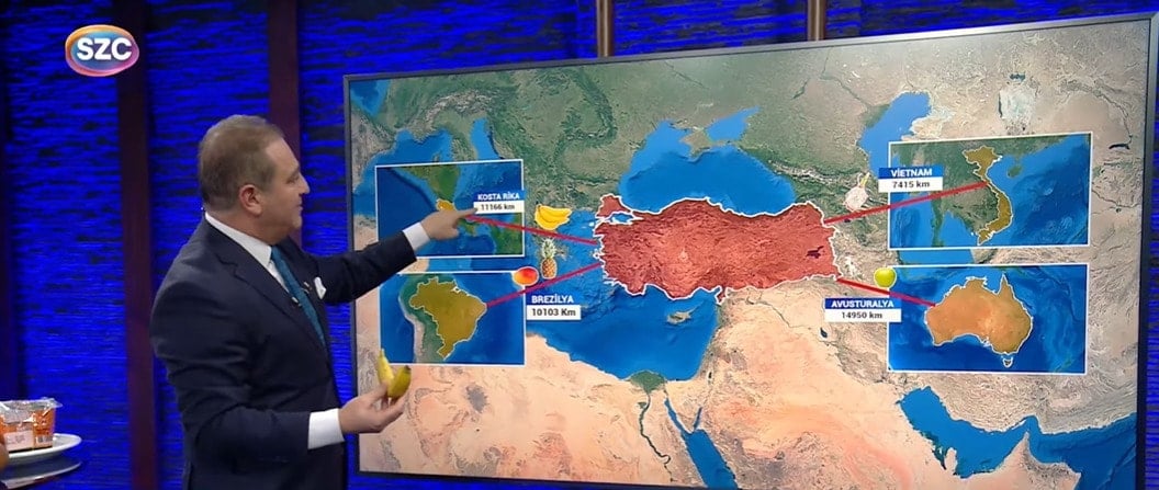 "- Yer Brezilya bu defa ananas getireceğiz. Meşhur meyve. Aç karnına yerseniz ödem attırır. Brezilya'da üretilen ananas Türkiye'de 80 lira. Türkiye'de üretilen ise 100 lira. Al sana Yerli ve Milli Üretim."