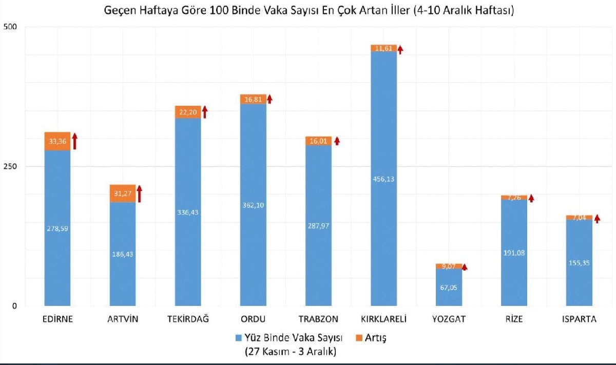 4-10 Aralık arasında vaka yoğunluğu bir önceki haftaya göre en çok artan 9 kent ise şöyle: Edirne, Artvin, Tekirdağ, Ordu, Trabzon, Kırklareli, Yozgat, Rize, Isparta.