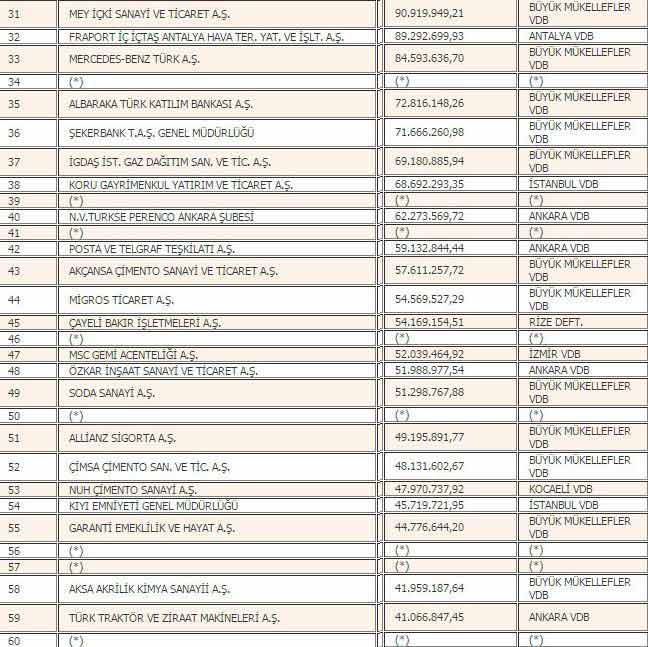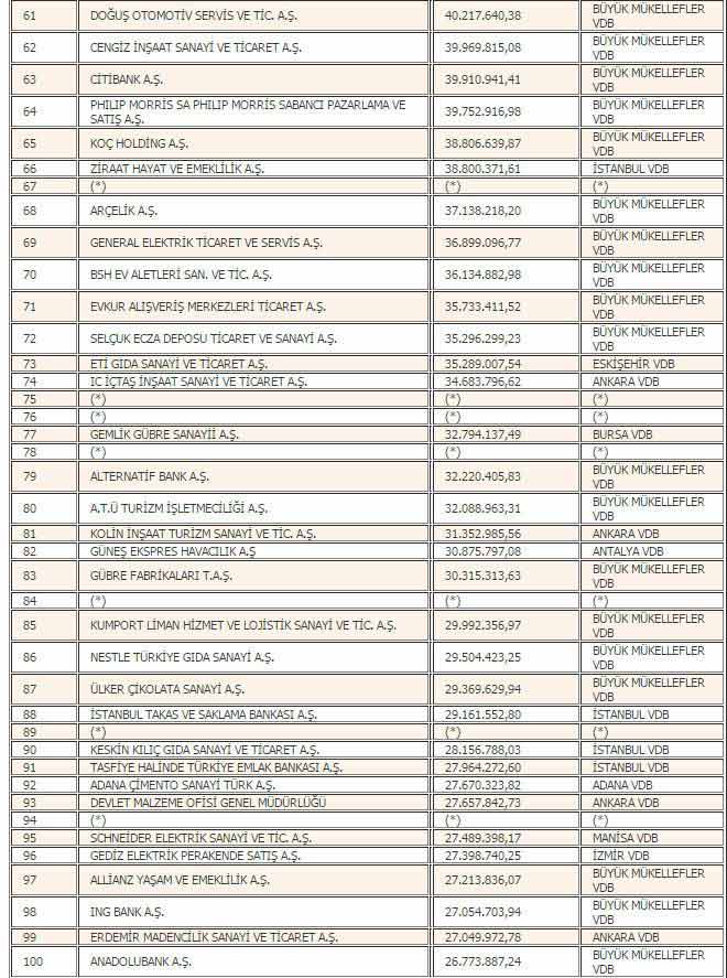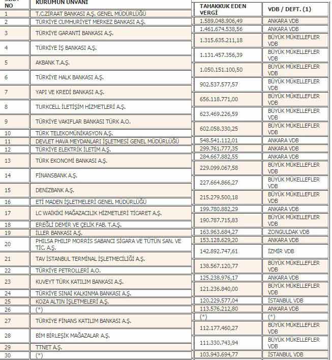 Geçen yıl en fazla kurumlar vergisi ödeyenler listesinde, Ziraat Bankasının ardından, Türkiye Cumhuriyet Merkez Bankası 1 milyar 461 milyon 674 bin 538,56 lira ile ikinci sırada yer alırken, Garanti Bankası 1 milyar 315 milyon 635 bin 211,18 lira ile üçüncü oldu.
