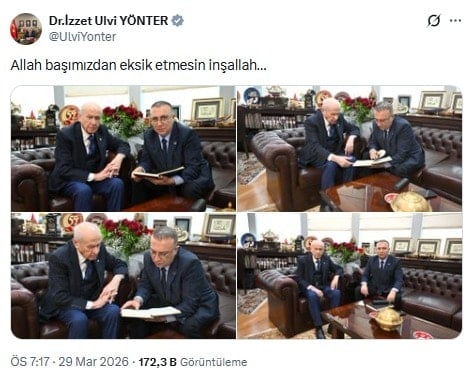 İzzet Ulvi Yönter, MHP Genel Başkan Yardımcılığı görevinden istifa etti. Yönter, sosyal medya hesabından yaptığı ilk paylaşımda Devlet Bahçeli ile birlikte ‘kara kaplı’ bir defteri inceledikleri fotoğraflara yer verdi ve paylaşımına, “Allah başımızdan eksik etmesin inşallah…” notunu düştü.
