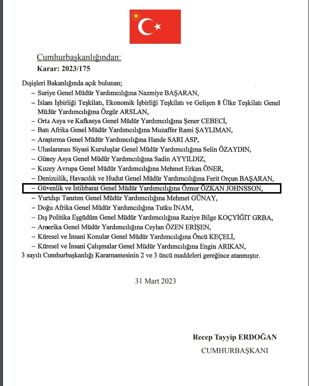 Gelecek Partili Hacı Bilal Aslan, atama için şu yorumu yaptı: “Dışişleri Bakanlığı Güvenlik ve İstihbarat Genel Müdür Yardımcılığı’na Öznur Özkan Johnsson atanmış. Türkiye’nin güvenlik ve istihbarat işini Johnsson’a emanet edenlerin konuya ilişkin ‘yerli ve milli’ bir gerekçeleri mutlaka vardır, değil mi?”
