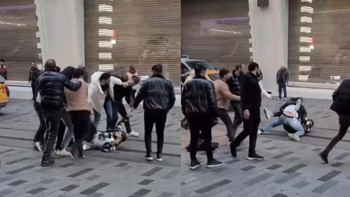 Beyoğlu'nda iki grup arasında 'kız arkadaşa laf atıldığı' gerekçesiyle tekmeli yumruklu kavga çıktı. İki grup cadde üzerinde bir süre kavga ettikten sonra çevredekilerin araya girmesiyle kavga sonra erdi.