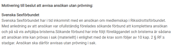 Seks Federasyonu başvurusunun reddedildiğine dair yapılan resmi açıklama.İsveç Spor Konfederasyonu'ndan, Seks Federasyonu ve Avrupa Seks Şampiyonası açıklaması