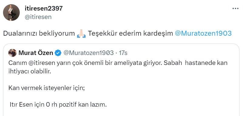 Twitter'da Esen'in ameliyat olacağını duyuran Murat Özen, "Canım Itır Esen yarın (bugün) çok önemli bir ameliyata giriyor. Sabah hastanede kan ihtiyacı olabilir. Itır Esen için 0 rh pozitif kan lazım" ifadelerini kullandı.