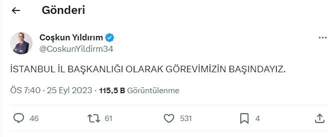 Coşkun, 25 Eylül'de sosyal medya platformu X üzerinden yaptığı paylaşımda "Görevimizin başındayız" ifadesini kullanmıştı.