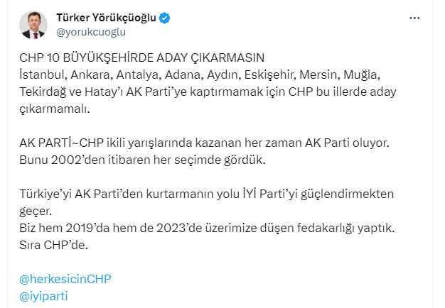 Yörükçüoğlu, “CHP 10 Büyükşehirde aday çıkarmasın” başlığı ile yaptığı çağrıda şu ifadeleri kullandı: